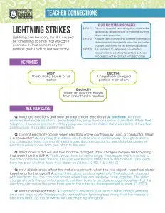 There are two kinds of electricity, current and static. STATIC ELECTRICITY is an electrical charge created when electrons make a single jump. We generally experience it as a result of friction. If you shuffle your feet across the carpet and then touch the doorknob, you might get a shock - that’s static electricity. As you move, you pick up a lot of extra electrons from the carpet. Your atoms don’t want the extra electrons, so they get rid of them by moving them to the doorknob. You perceive that electron movement as a shock. You might even see a spark or hear a crackle. The electrons travel to the doorknob because it is made of metal, which is a conductor. Conductors allow electricity to flow through them. Lightning is an example of a huge spark of static electricity caused by the buildup of electrons in clouds. The electrons move in a giant bolt between the cloud and the ground or between the cloud and another cloud. The average bolt of lightning is 6 miles long and travels at 140,000 mph! Lightning strikes have been known to reach temperatures of 54,000 degrees Fahrenheit, hot enough to make the air glow (that’s what you see as a bolt) and melt sand into glass. Lightning does not even need to strike in close proximity to a thunderstorm – it can be found as far as 10-15 miles away.