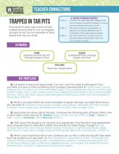 In nature, we find a variety of different liquids. One of the most interesting is tar. TAR is a highly viscous liquid that is typically a byproduct of coal production, but can also form other organic matter breaking down. Tar only bubbles up to the earth’s surface in a few places on the planet. When it does, it can form very large pools called tar pits. Los Angeles is home to one of the world’s most famous of these, the La Brea Tar Pits. Some forms of tar are up to 230 billion times more viscous than water. There is an experiment running in which tar flows from a funnel, but because the tar is so viscous, only 9 drops have fallen since 1927 when the experiment was begun! In fact, it wasn’t until July 2013 that a drop of tar falling was actually captured on camera. That experiment is still being streamed today: Pitch Drop Livestream. In ancient times, animals inadvertently wandered into the pits and got stuck because the tar is so thick. Scientists have excavated thousands of fossils from the pits and learned incredible things about our prehistoric world - Tar Pit Video